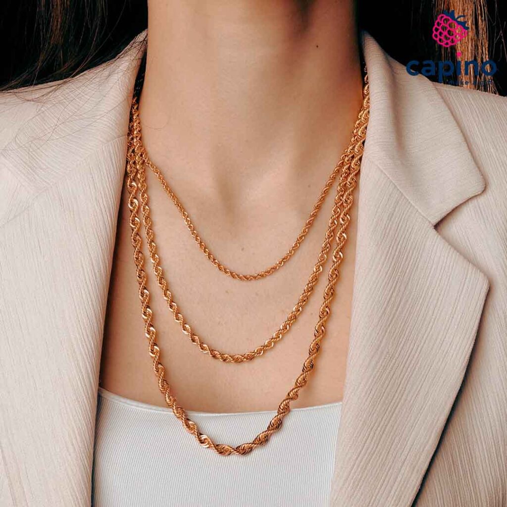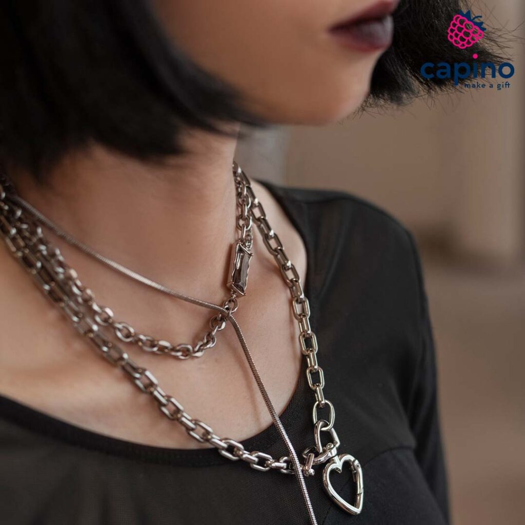 - Синджири с различни форми и цветове. Ние от Capino казахме по-горе, че просто няма табута за нюансите на бижутата и комбинациите от различни видове плетки. Нека кажем отново: къси и дълги сребърни синджирчета от различни стилове вървят добре заедно. Можете да направите всяка комбинация: