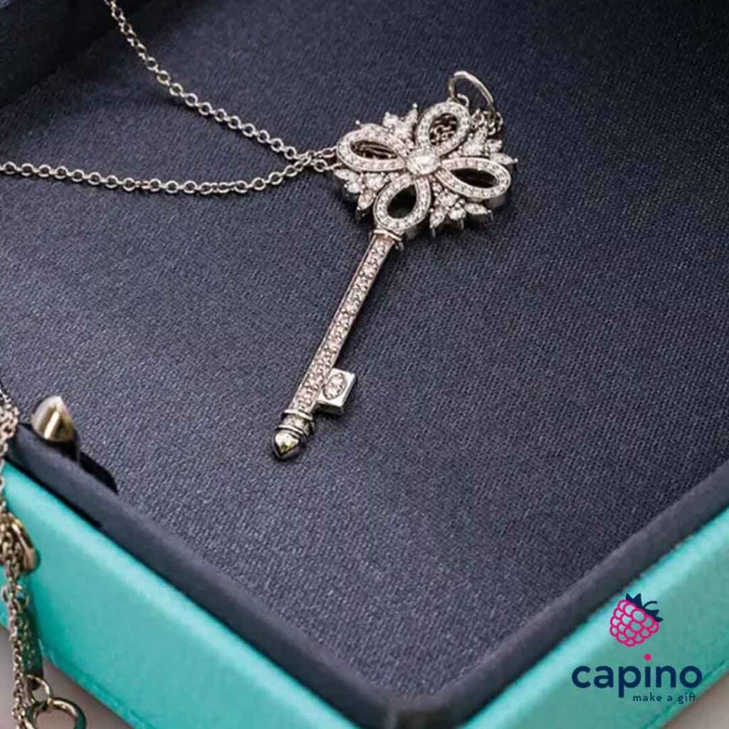 - Висулки под формата на ключове. Висулки от бяло, розово и жълто злато, декорирани с диаманти, се считат за един от най-емблематичните и желани аксесоари. Тифани успя да избере един от най-символичните предмети. Ключ – да го постави близо до женското сърце и да го изпълни не само с естетическо, но и с философско съдържание;
