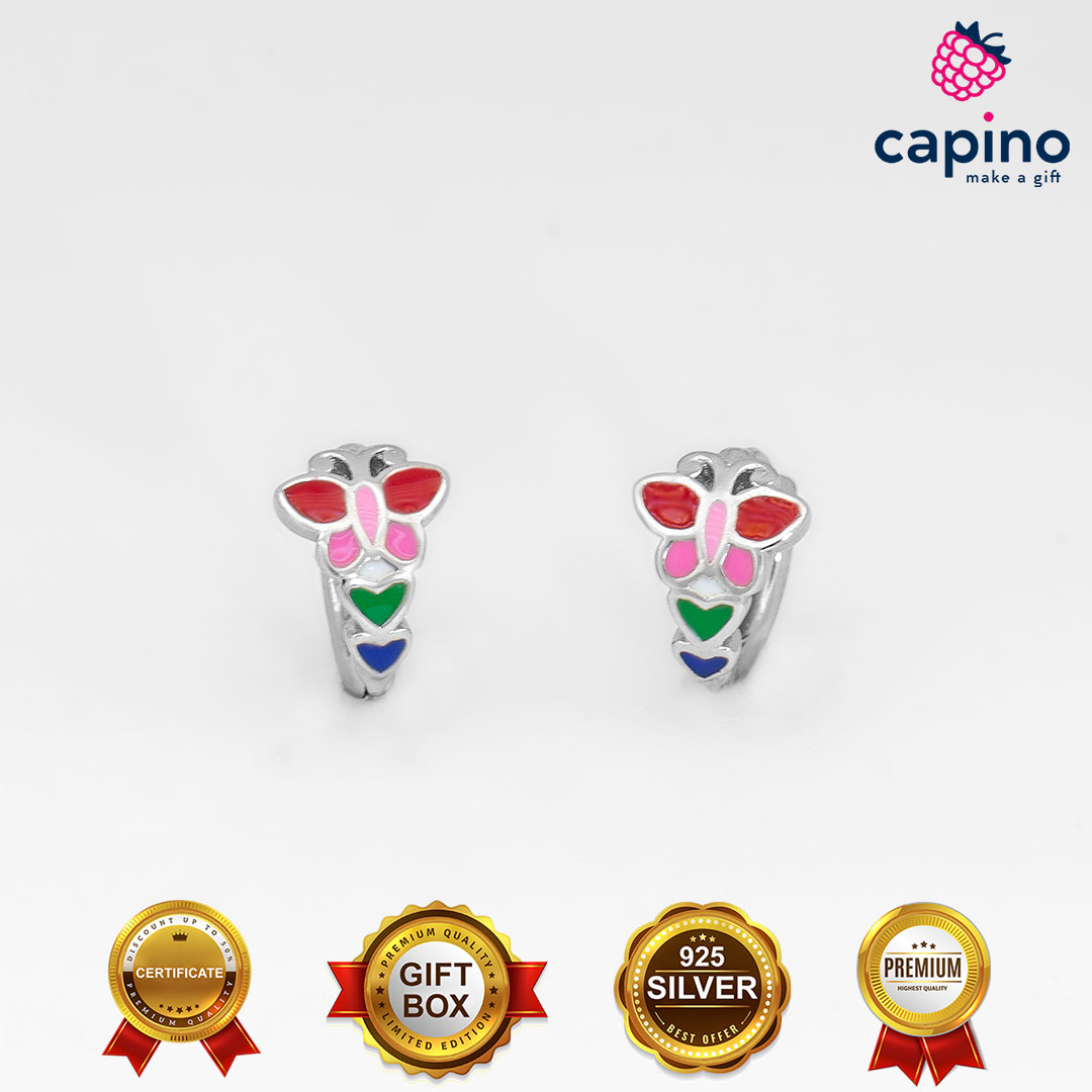 Детски сребърни обеци пеперуда Ella са изработени от сребро проба 925 със сретификат за качество. Обичките тежат 1,7 грама, високи са 0,7 см., а широки 1 см. Те имат горещ емайл, също така и родиево покритие. При поръчка на Детски сребърни обеци пеперуда Ella Вие получавате безплатна подаръчна кутийка.