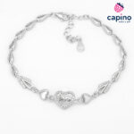 Създадена за тези, които обичат изящните бижута сребърна гривна Love Annunziata е изключително изтънчено бижу, което е символ на елегантност, романтика и финес в едно. Идеален избор за жени, които ценят нежността и стилната изразителност. Изработена от благородно сребро проба 925, тя носи усещане за качество и трайност, а родиевото покритие предпазва метала от потъмняване и запазва блясъка му за дълго време. С тегло от 5,6 грама и регулируема дължина от 17 до 21 см, гривната се приляга леко и удобно върху китката, а фината ширина от 1 см подчертава деликатния ѝ характер. В центъра на дизайна сияе красиво инкрустирано сърце, обсипано с миниатюрни циркониеви камъчета, които придават магическо сияние, а в средата му е елегантният сребърен надпис „Love“, който носи послание за нежност и обич. От двете му страни са разположени още две малки, плътни и изчистени сърчица, а цялата дължина на гривната е решена в свързани изчистени капковидни елементи. Като допълнителен детайл по верижката, и за да придадат още повече изтънчена елегантност, майсторите бижутери са инкрустирали още няколко блестящи цирконии. Гривна Annunziata ще се превърне в малък символ на романтика и стил, който превръща всяка визия в изискано изявление. Всяко бижу пристига в луксозна подаръчна кутийка, създавайки усещане за специален и незабравим подарък. А сертификата на среброто проба 925, е гаранция и доказателство за качеството на използваното сребро.